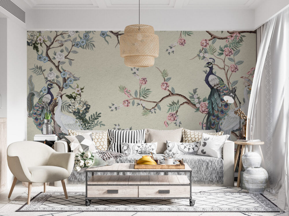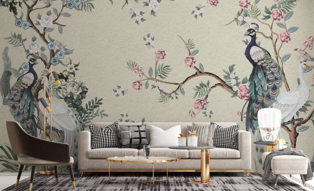Beige Peacocks With Flowers Design BWMUR8048-K