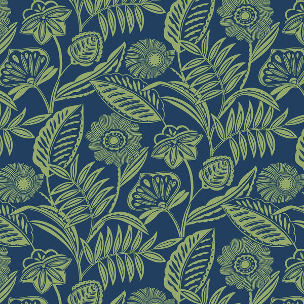 A contemporary take on a traditional floral design, featuring colour blocking and intricate details. Please note: This design is wide width. Seen here in the Blue/Green colourway.