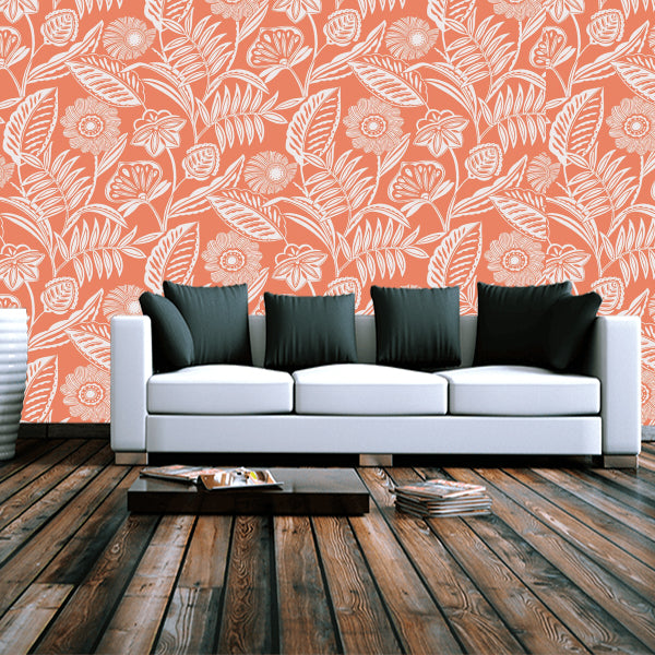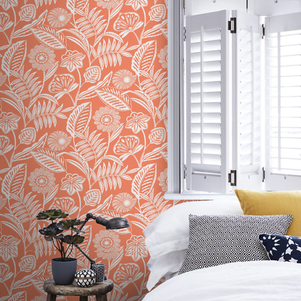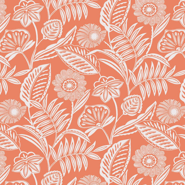 A contemporary take on a traditional floral design, featuring colour blocking and intricate details. Please note: This design is wide width. Seen here in the Coral colourway.