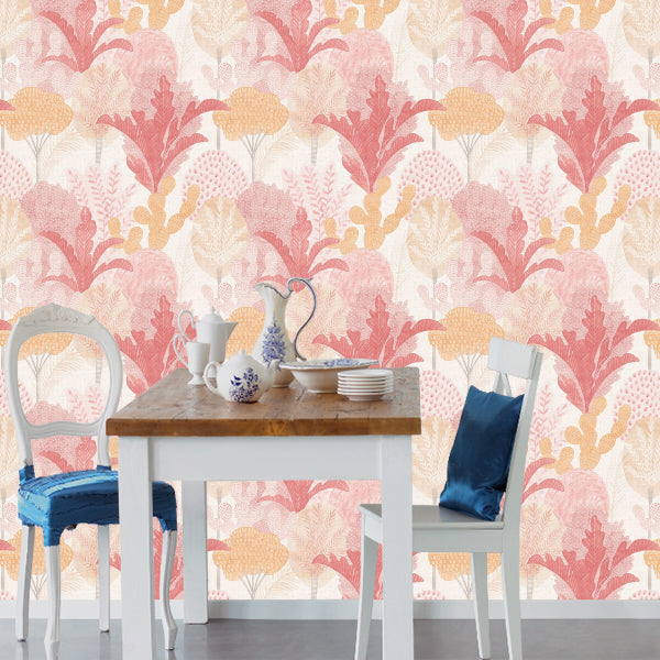 Bring the tropics to your walls with this bold and beautiful design! Showcasing several types of tree with tall trunks, luscious leaves and even cacti. Seen here in the Pink colourway.