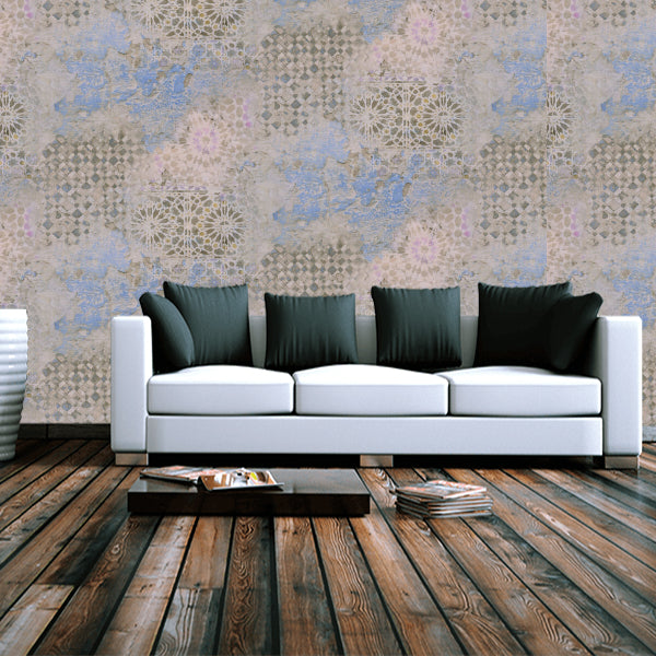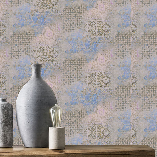 An authentically textured design that showcases beautiful mosaic tiles set against rustic concrete walls. Perfect for bringing a warm and intricate feature to your walls with vibrant colour. Seen here in the Aqua colourway.