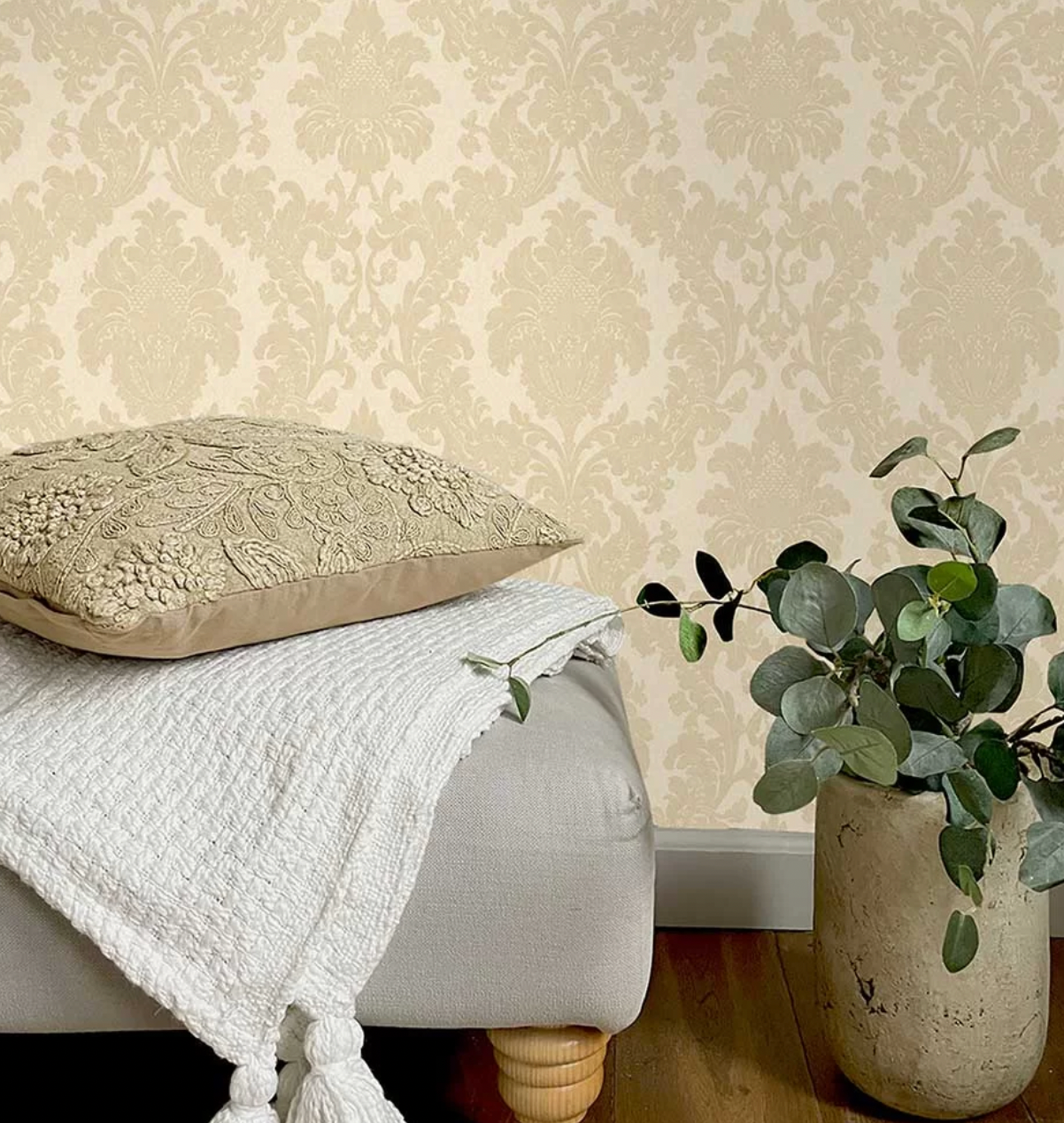 A buttery-cream damask on a natural straw yellow grasscloth background. Other colourways are available.