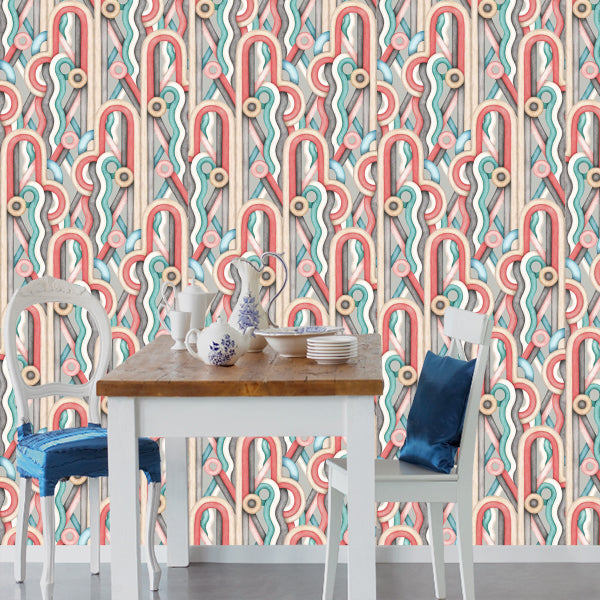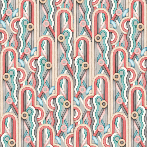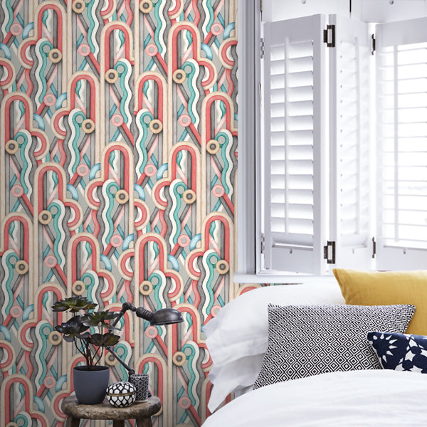 A striking and eye catching design; showcasing busy and flamboyant shapes, filling this design with joy. Archways and circles overlap in an organised and flowing manner - Adding true artistry and creativity to your walls. Seen in the Grey/Green colourway.