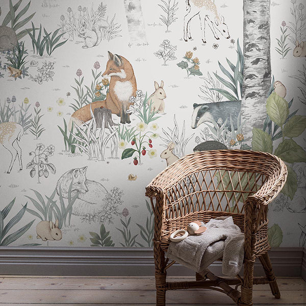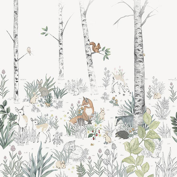 Come and explore the enchanted forest! Where sparrows, squirrels, rabbits peek out through the tall trees and lush flowers. This mural is supplied on a W:45cm x L:2.65m roll, in 6 panels. Total size of mural is 2.7m x 2.65m.