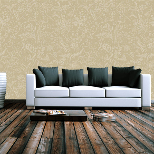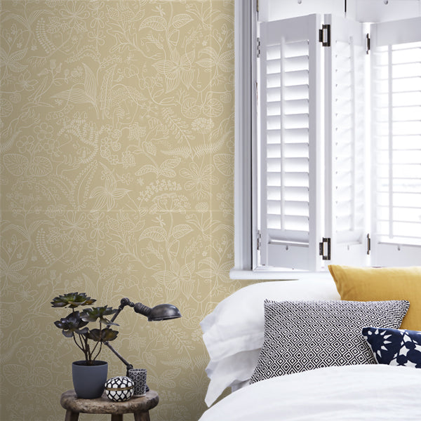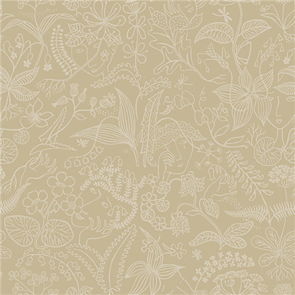 A beloved classic, our Grazia wallpaper, with a muted yellow background and light beige pattern, depicts soft flowing flowers and leaves with faces peering through the foliage. Recalling the fun and freedom of a Swedish summer garden, it adds a warm and bright loveliness to the surrounding space. Hang it in your office, bedroom or living area to enhance and uplift your interior.