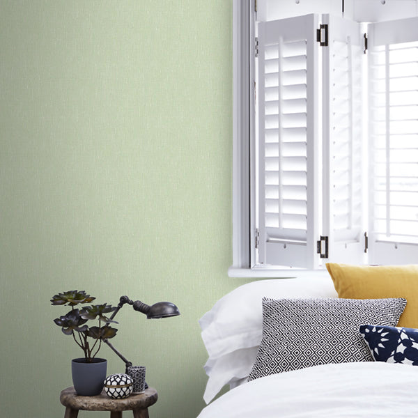 Linen is a plain wallpaper with a structured surface, which is tactile and harmonious. The Linen collection features natural colours that follow the seasons, shown here in a Leaf Green. This wallpaper has a free pattern match.