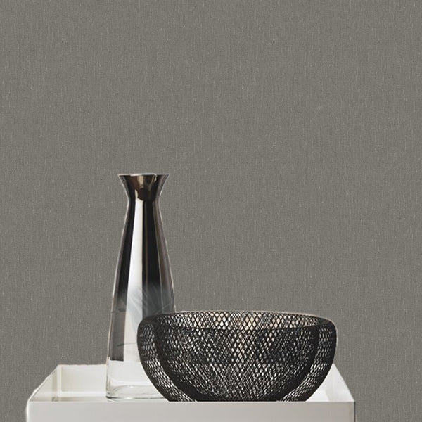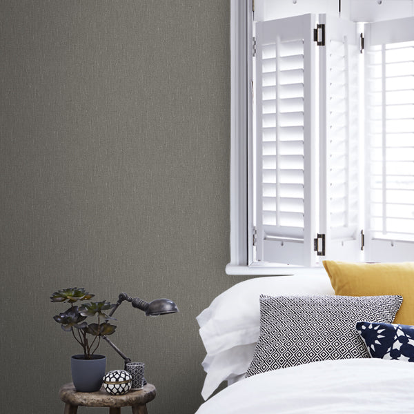 Linen is a plain wallpaper with a structured surface, which is tactile and harmonious. The Linen collection features natural colours that follow the seasons, shown here in the linen black shade. This wallpaper has a free pattern match.