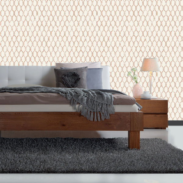 A distressed print of an elongated honeycomb design, shown here as a copper pattern on a creamy white linen background. Other colourways are available.