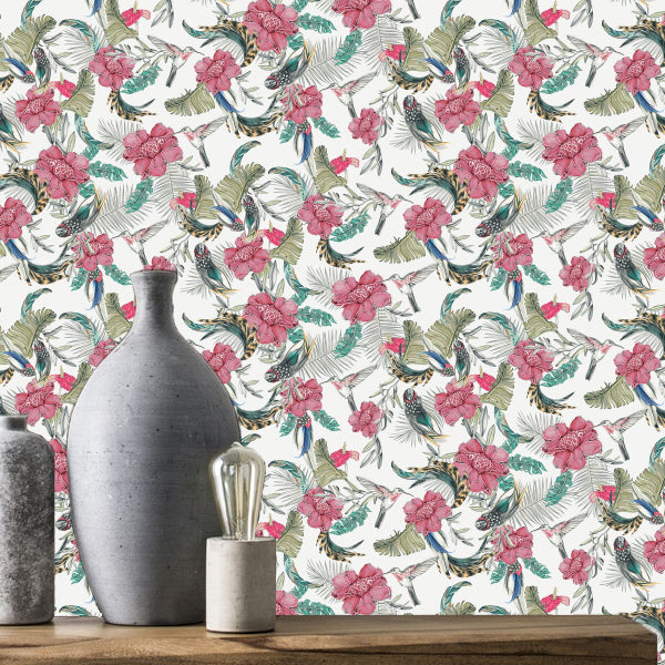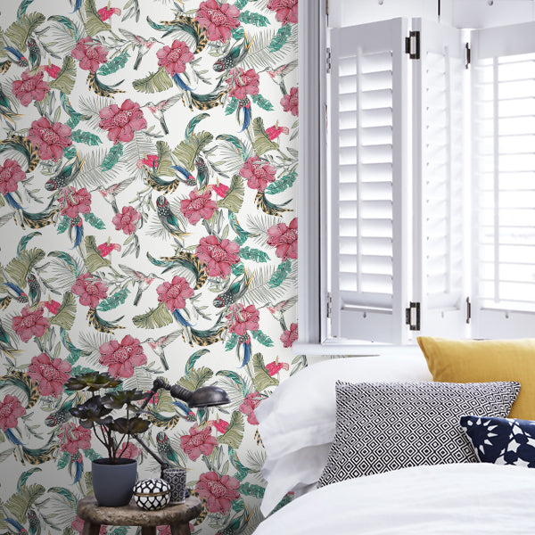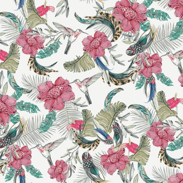 A cascading wall of delicate flowers, fluttering birds and lush leaves - showcasing stunning falling feathers. Bring stunning flora and fauna to your walls. Seen in the White colourway.