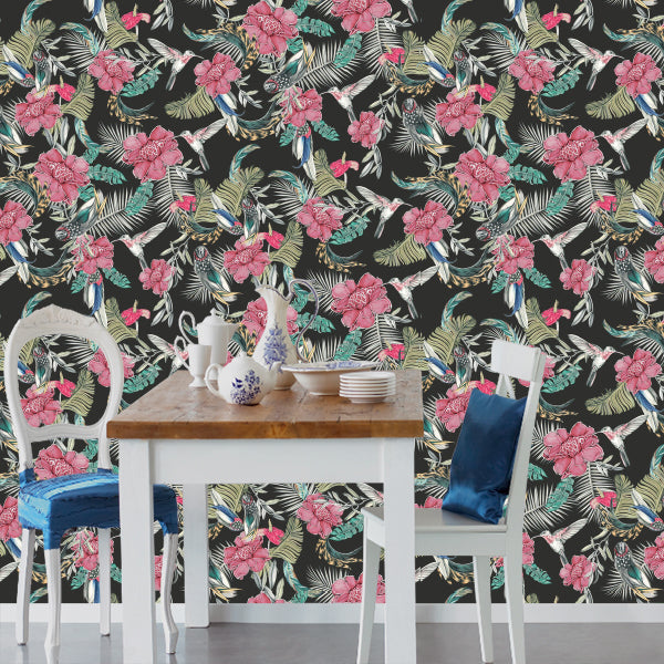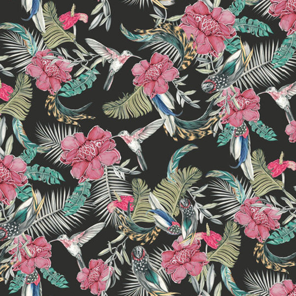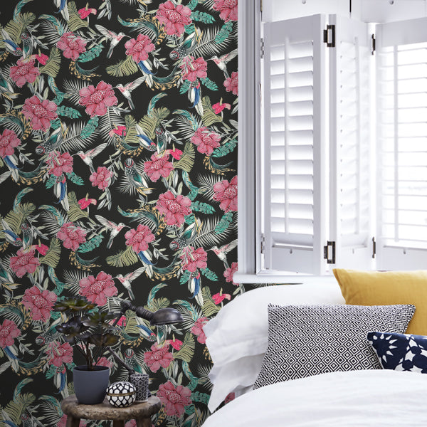 A cascading wall of delicate flowers, fluttering birds and lush leaves - showcasing stunning falling feathers. Bring stunning flora and fauna to your walls. Seen in the Black colourway.