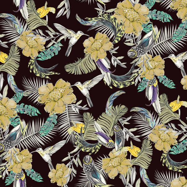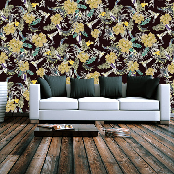 A cascading wall of delicate flowers, fluttering birds and lush leaves - showcasing stunning falling feathers. Bring stunning flora and fauna to your walls. Seen in the Aubergine/Yellow colourway.