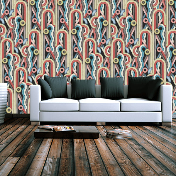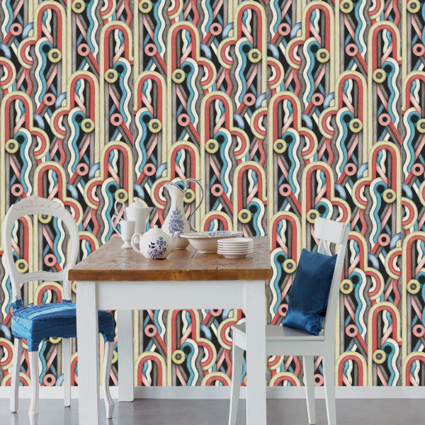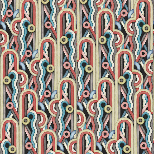 A striking and eye catching design; showcasing busy and flamboyant shapes, filling this design with joy. Archways and circles overlap in an organised and flowing manner - Adding true artistry and creativity to your walls. Seen in the Black / Red colourway.