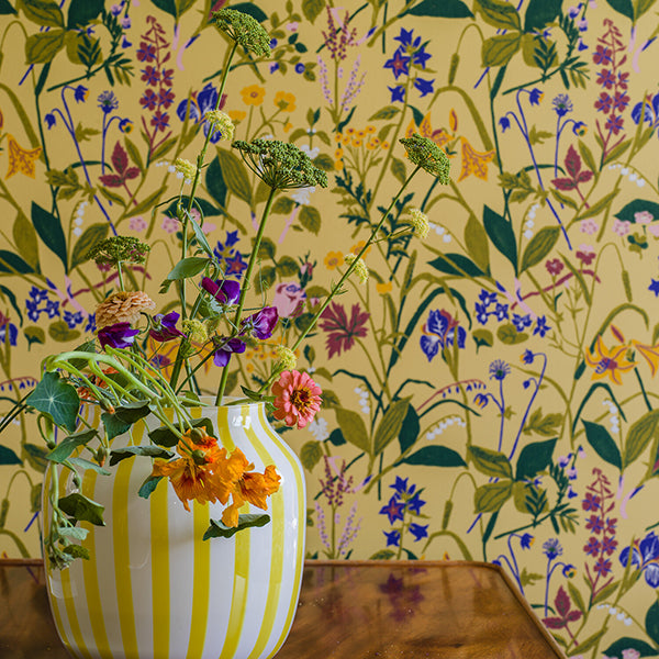 Coloured in a delicate, soft palette of yellow, green, white and blue, our Ros och Lilja wallpaper recreates the classic 1940s Swedish textile design of Gocken Jobs. Bringing the splendour of Swedish summer flowers into your home, it creates a wonderfully relaxed and soothing space. Hang it in your bedroom or kitchen for effortless elegance.
