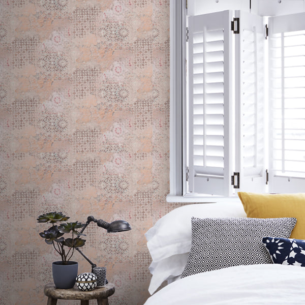 An authentically textured design that showcases beautiful mosaic tiles set against rustic concrete walls. Perfect for bringing a warm and intricate feature to your walls with vibrant colour. Seen here in the Terracotta colourway.