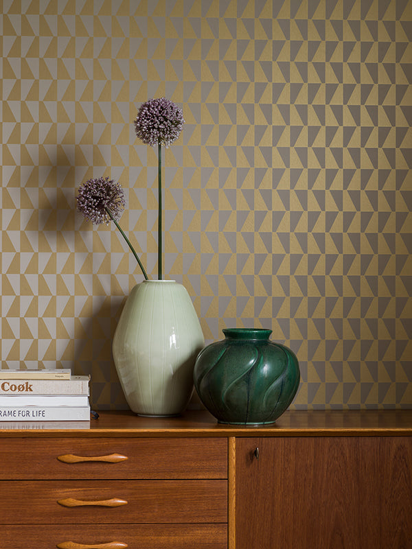 Coloured in beige and shimmering gold, our hypnotic Trapez wallpaper, with its geometric design will bring a contemporary feel to its surrounding space. This arresting pattern by popular designer Arne Jacobsen from the 1950s is a favourite amongst stylists and architects and looks just as at home today. Add retro character to your living room, dining area or bedroom with this wonderful two-tone paper.