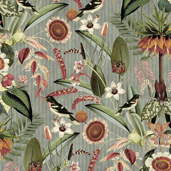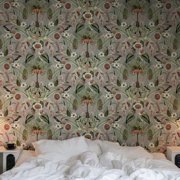 A straightlaced stripe gives structure to the lush mish-mash of flowers and animals here. This wallcovering is for those who dare, but the stripes do hold the pattern together and enable you to use the paper in a whole room. And isn’t it fun to see a wallpaper with a sense of imagination as rich as your own?
