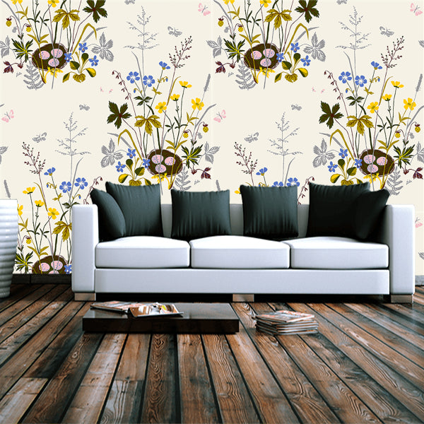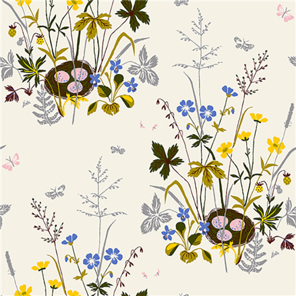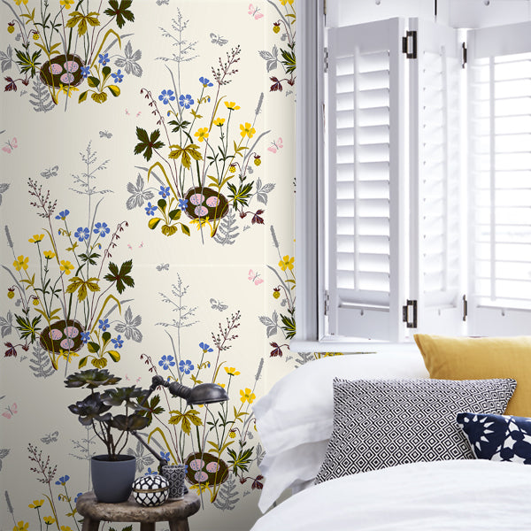 Coloured in a delicate faded palette of yellow, green, blue, red, pink and grey, our Fågelbo wallpaper is a tribute to a Swedish spring garden with its intricately illustrated wildflowers and egg filled bird’s nests. The pattern, designed in 1943 by Lisbet Jobs, originally for textiles and now on wallpaper is made through the technique of overprinting colours to create a beautiful glow and brilliant hues. Hang it in a living room or bedroom for a stunning vintage aesthetic.