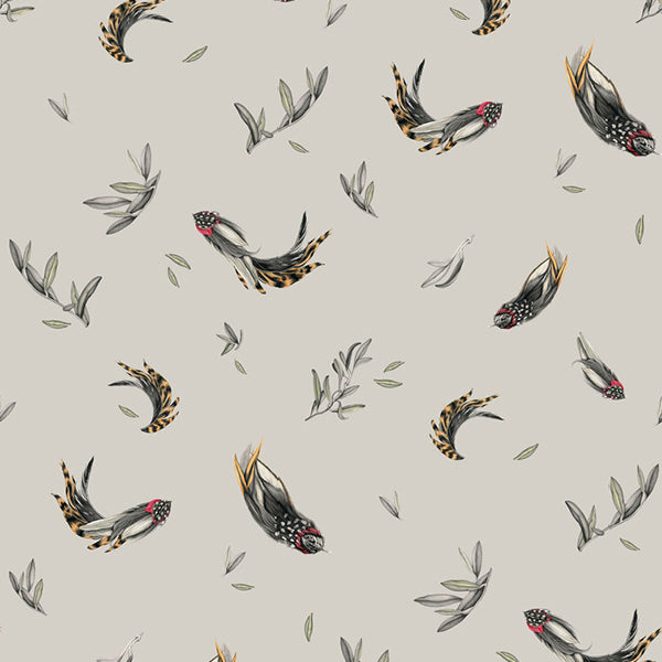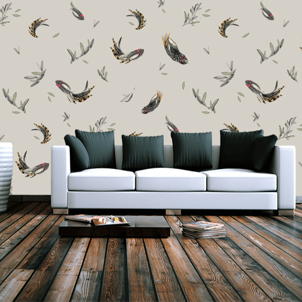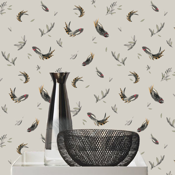 Cascading feathers fill this design with a stunning and whimsical ambience. Set against a flat background, intricate detailing and hints of colour are perfect for adding signature style to your walls! Seen in the Soft Grey/Orange colourway.