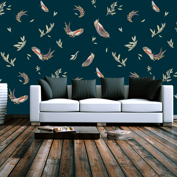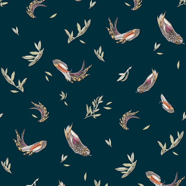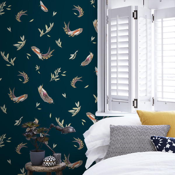 Cascading feathers fill this design with a stunning and whimsical ambience. Set against a flat background, intricate detailing and hints of colour are perfect for adding signature style to your walls! Seen in the Deep Green colourway.