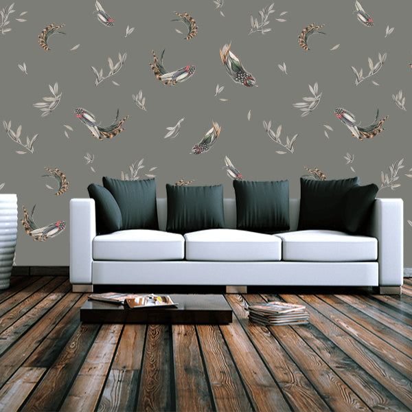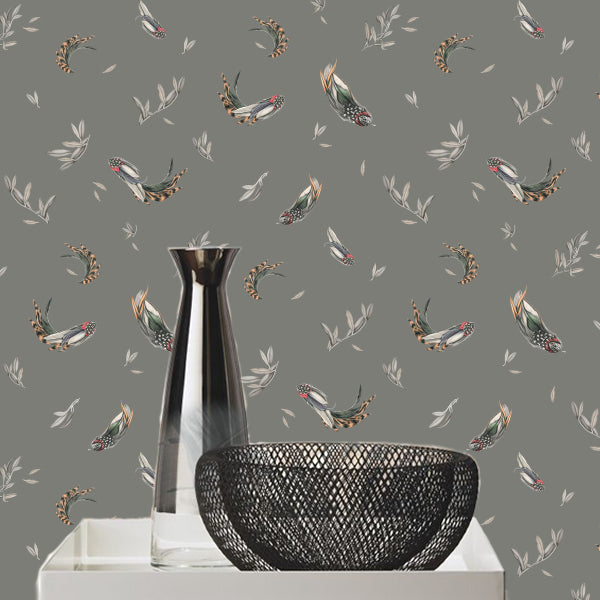 Cascading feathers fill this design with a stunning and whimsical ambience. Set against a flat background, intricate detailing and hints of colour are perfect for adding signature style to your walls! Seen in the French Grey colourway.