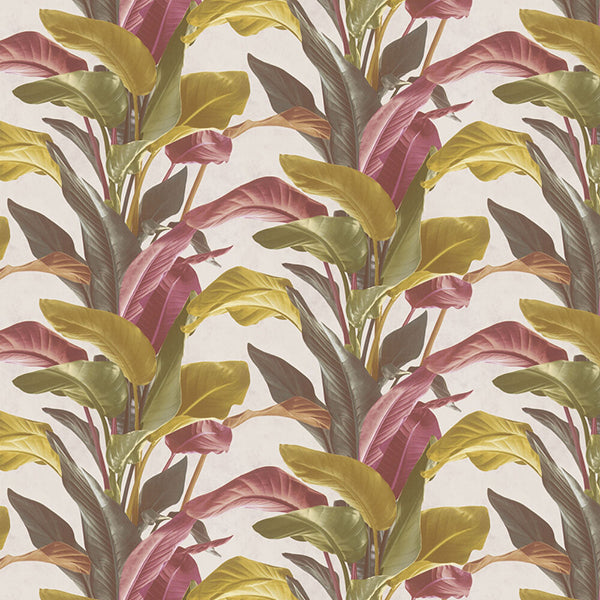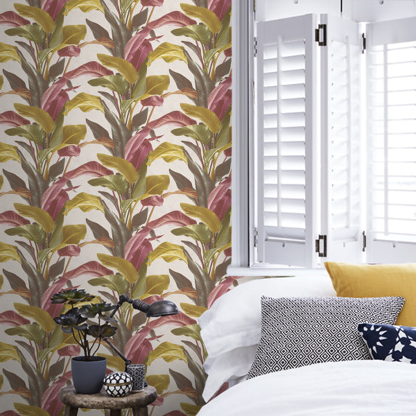 Vibrant, oversized tropical leaves fill this design with bright and bold colour, making a dramatic statement on your walls. Seen here in the Crimson colourway.