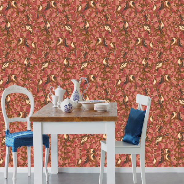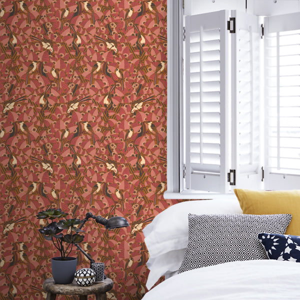Perching, playful birds fill this design with an abstract and artistic flair; perfect for adding a bustling ambience to your walls. Please note: This product is wide width. Seen here in the Blush / Terre De Sienne colourway.
