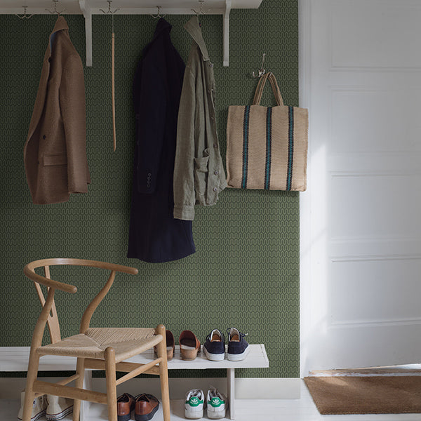Coloured in hues of muted warm yellow, our Ypsilon wallpaper is taken from the archives of world-famous Danish architect and designer Arne Jacobsen. Featuring a simple yet entrancing pattern of repeated wavy lines, it is a true classic. Hang it in your hallway, kitchen or bedroom for a classic understated aesthetic.