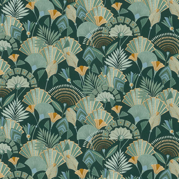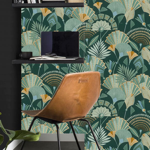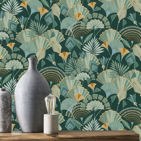 Modern and enchanting, this deco style design brings a touch of natural glamour to your walls, featuring deep, sumptuous colour and metallic highlights. Seen here in the Green colourway. Please request a sample for true colour match.