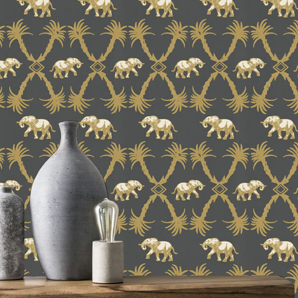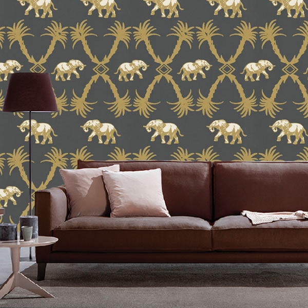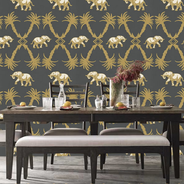 An all over design with rows of elephants separated by palms in an almost trellis pattern with a hand block printed look. Shown in the gunmetal grey with metallic gold. Sorry the metallic doesn't show well, so please do request sample for true colour and texture.