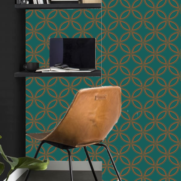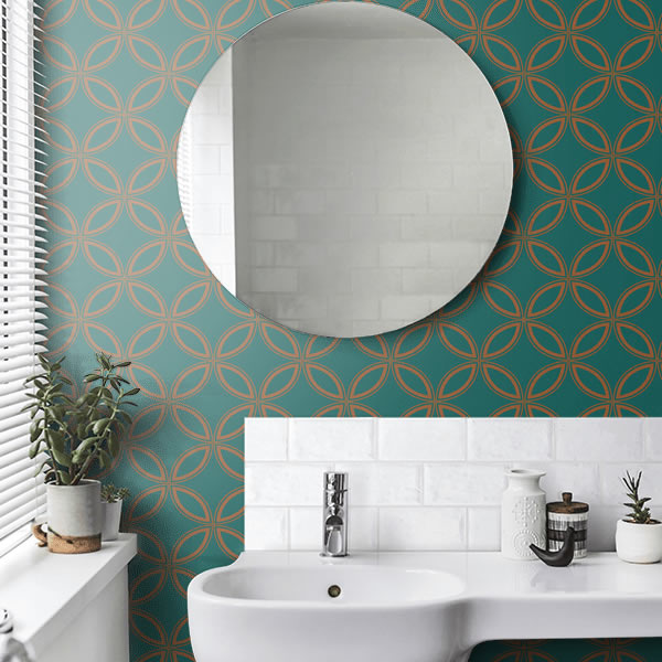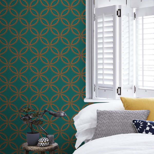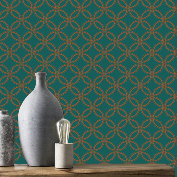 A classic repeating geometric design in lustrous metallic copper printed on a lightly textured background. Shown here in the Teal colour.