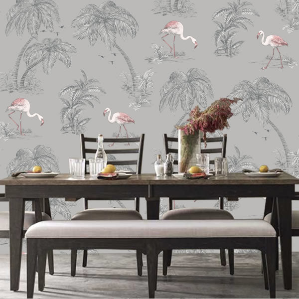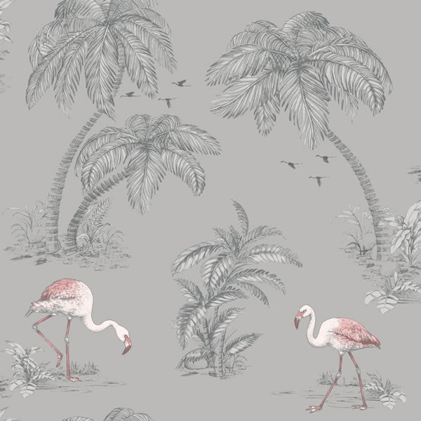 A fun and flamboyant wallpaper, featuring motifs of elegant flamingos and palm trees. Shown here in the grey and pink colourway. Other colourways are available.