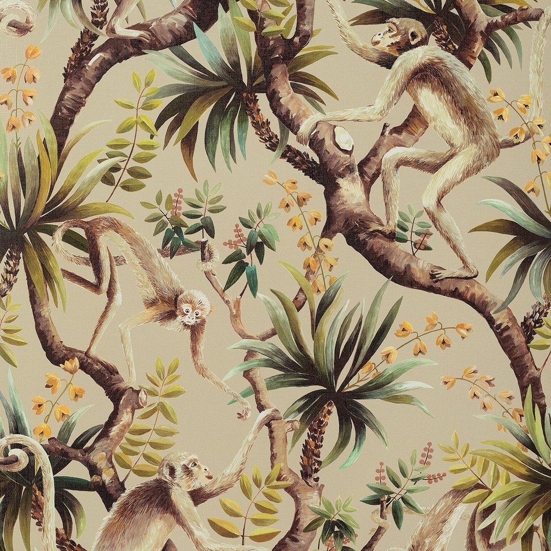 Mischievous monkeys climb to and fro on tropical foliage in this playful and practical wallcovering. Hand painted in gouache and digitally printed, this textile captures the brushstrokes and painterly nature of the original artwork. The motifs take reference from the ceramic monkey statues found in Elvis’s ‘Jungle Room,’ a tropical-inspired kitsch retreat within his Memphis home. The design’s name references the Chuck Berry song ‘Too Much Monkey Business’ covered by Elvis on his ‘Elvis Sings Flaming Star’ album in 1969. Monkey Business is printed onto the same substrate as our embossed La Palma paper-backed vinyl wallpaper, making it suitable for bathroom applications.