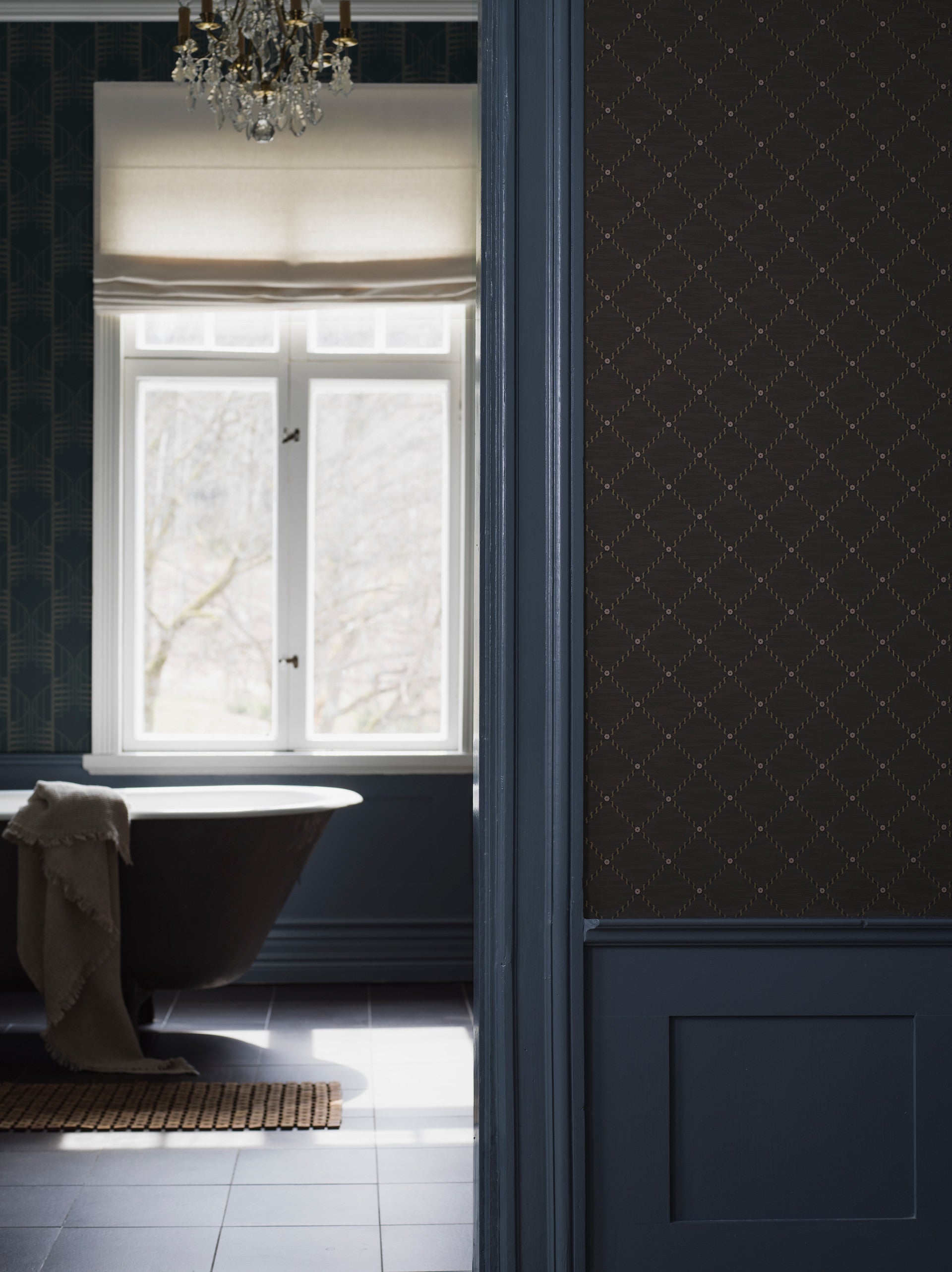 Coloured in a dark brown with shimmering gold detail, our Golden Trellis wallpaper is elegant and playful. Discovered in an atlas dating from 1934, its pattern features a decorative trellis with small and dainty flowers in soft pink tones. Simply splendid on its own, it also works wonderfully in combination with more expressive designs. Hang it in your hallway, staircase or bedroom for a bold and luxurious aesthetic.