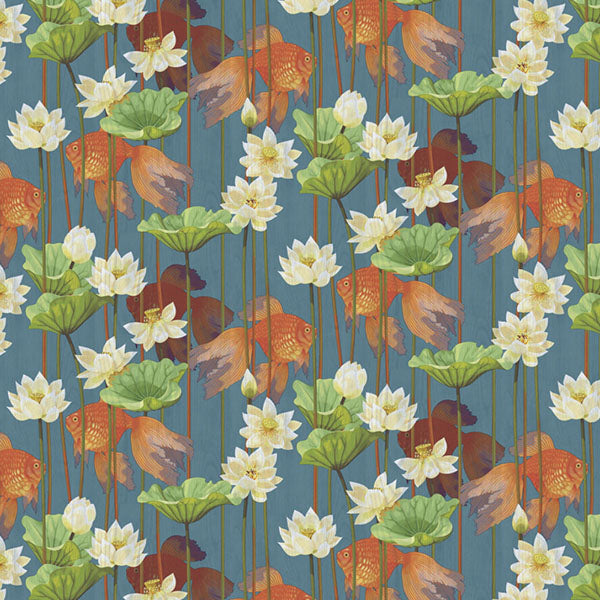 Bright and playful fish swim amongst tall, blooming flowers and leaves; highlighted with stunning, bold colours. Seen here in the Blue colourway. Please request a sample for true colour match.
