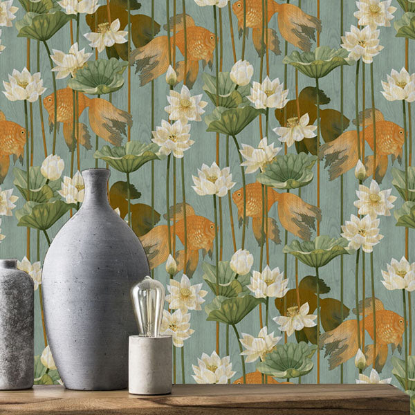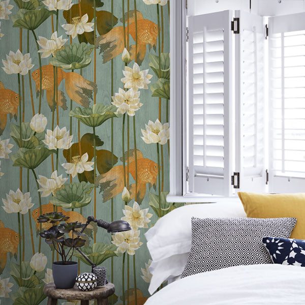 Bright and playful fish swim amongst tall, blooming flowers and leaves; highlighted with stunning, bold colours. Seen here in the Teal colourway. Please request a sample for true colour match.