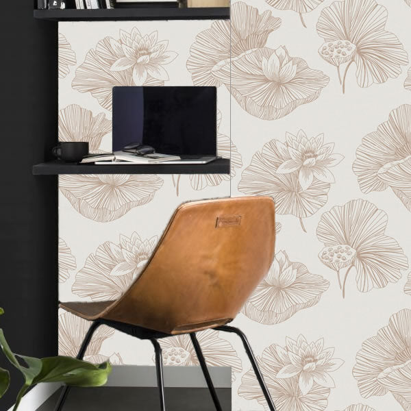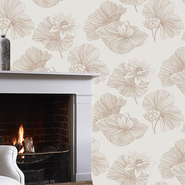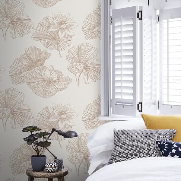 Symbolising purity and beauty, the Lotus flower is the focus of this stunning contemporary wallpaper. The design features lustrous metallic rose gold detailing printed on a lightly textured background. Shown here in the Cream colour.