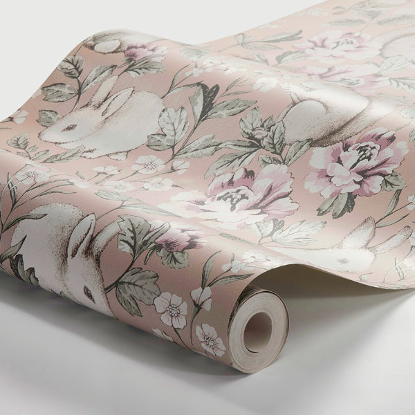 Adorable rabbits, perching sparrows and curious squirrels sitting amongst trailing foliage and lush flowers. Fill your walls with nature and joy! Seen here in the Pink colour.