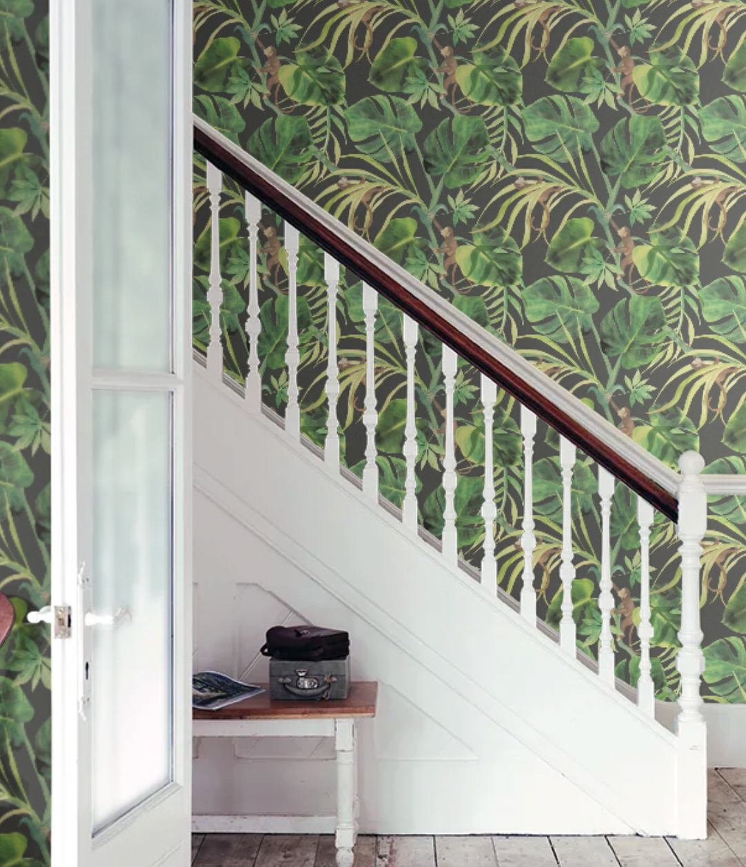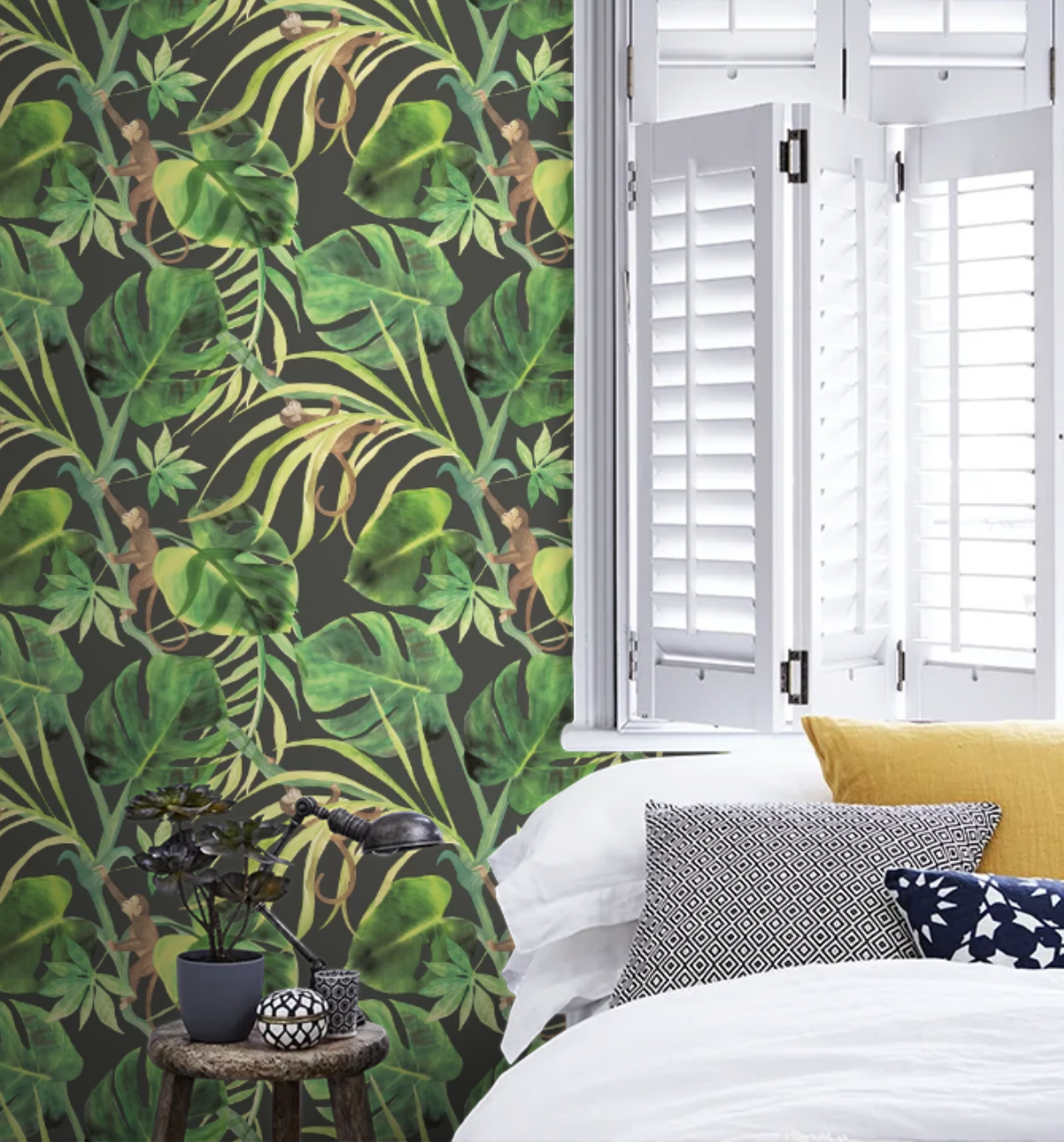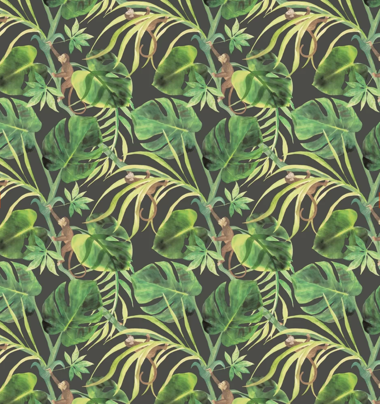 A fun green jungle leaf design, set on a coloured background with mischievous monkeys leaping through the leaves. Shown in the ebony colourway - other colourways available.