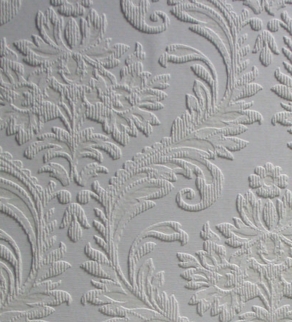 A premium, deeply textured blown vinyl wallcovering on a flat backed paper. Embossed damask design. This wallcovering is white and is designed to be painted a colour of your choice. Pattern repeat 32cm.