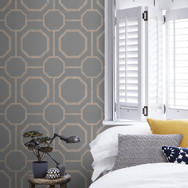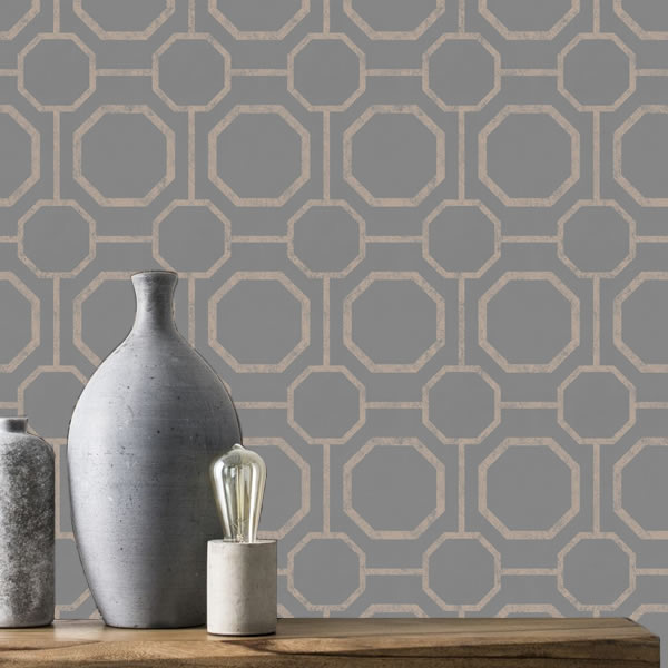 A bold, uncomplicated geometric design in lustrous metallic rose gold printed on a lightly textured background. Shown here in the Rose Gold / Grey colour.