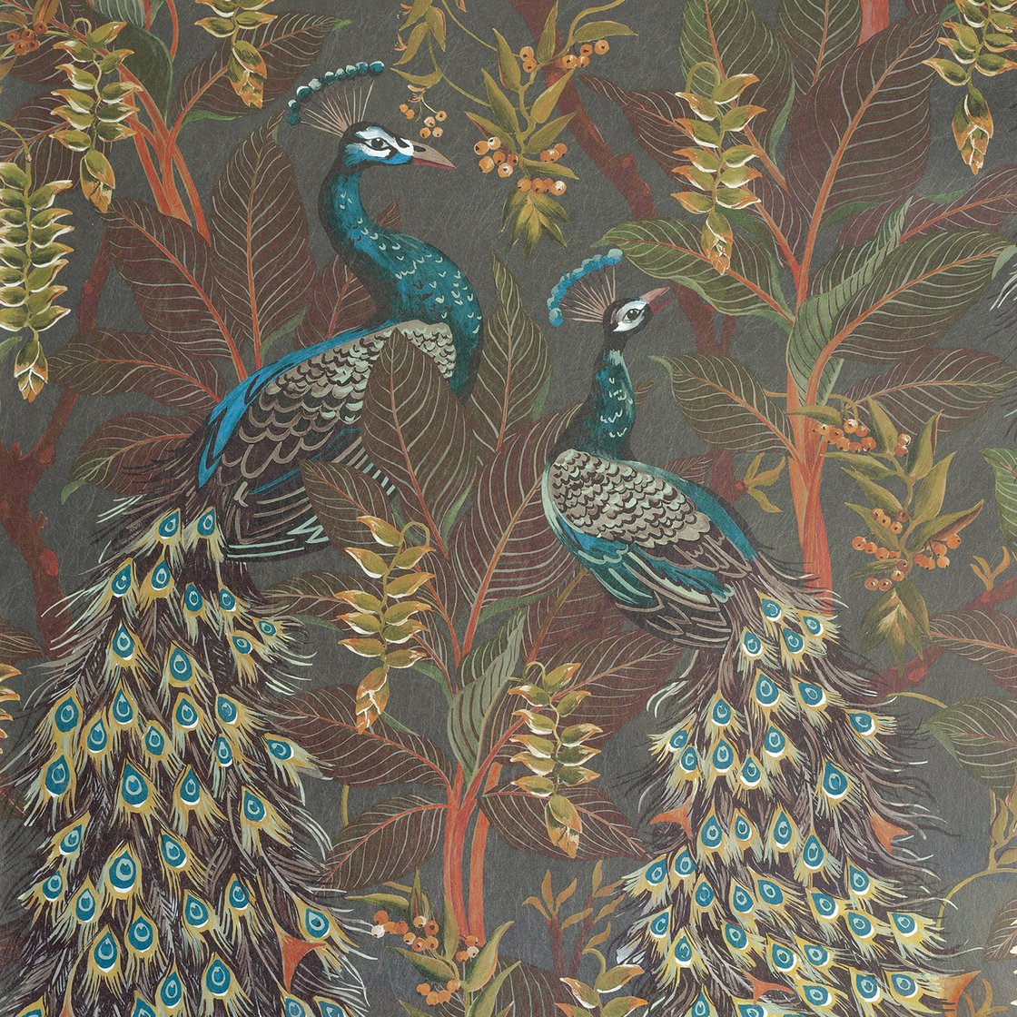 Brightly coloured, stylized peacocks adorn the handmade stained-glass doors which separate the living room from the music room in Elvis’s iconic Graceland home. Regal peacocks sit proudly amongst lush heliconia palms laden with flowers. The design has been expertly hand painted in gouache and digitally printed onto a textured non-woven substrate, replicating the aesthetic of handwoven paper with a subtle iridescent finish. This bespoke print is also available in a coordinating drapery, digitally printed onto a wide 100% linen base cloth and expertly finished creating a sumptuous, soft textile.