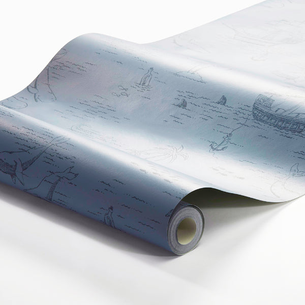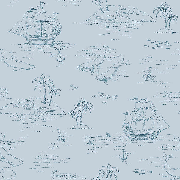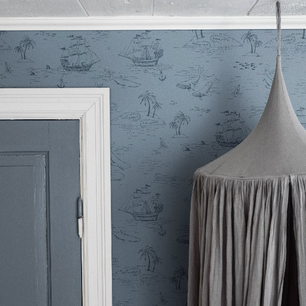 A magical wallpaper that takes you room out to the seven seas. Seen here in A Flog Blue colour. Please request sample for true colour match.