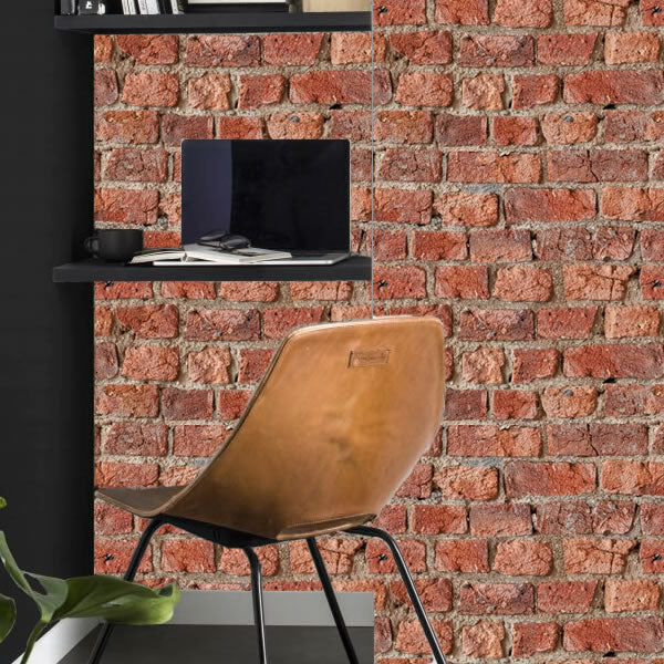 A brick wall effect wallpaper. Shown here in traditional red brick colours