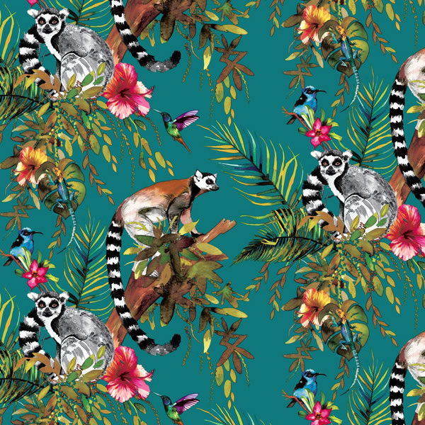 A flamboyant wallpaper design featuring a trailing pattern of tropical foliage, which includes hummingbirds, gecko's and lemurs! Shown here in the teal colourway