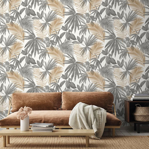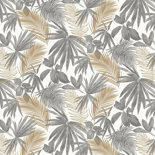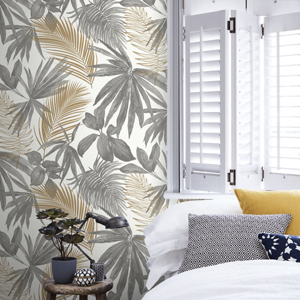 Delicate and painterly style leaves fill this design with an elegant and chic style, emphasised with shimmering gold highlights and details. Seen here in the Grey colourway. Please request a sample for true colour match.