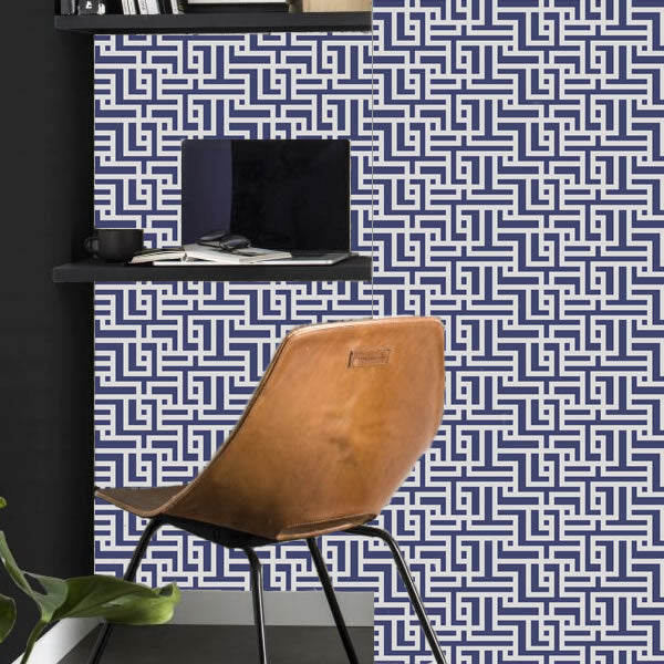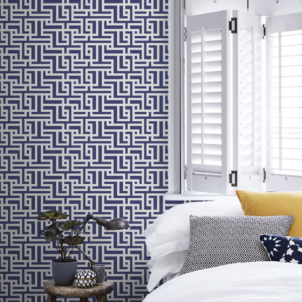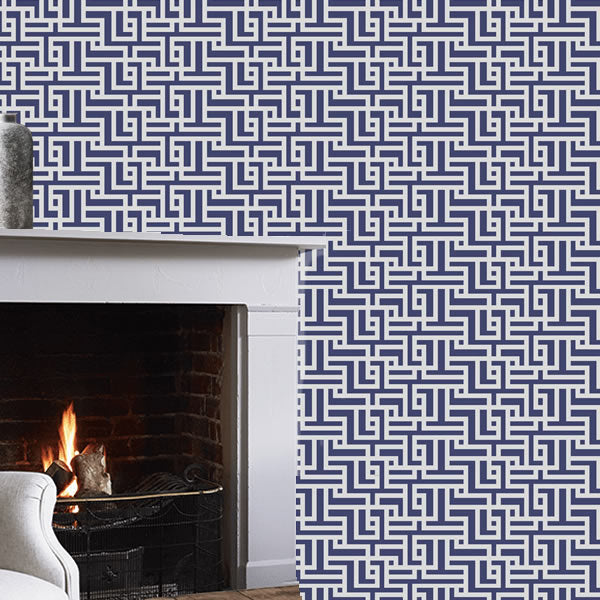 A maze-like geometric design in lustrous metallic silver printed on a lightly textured background. Shown here in the Navy colour.