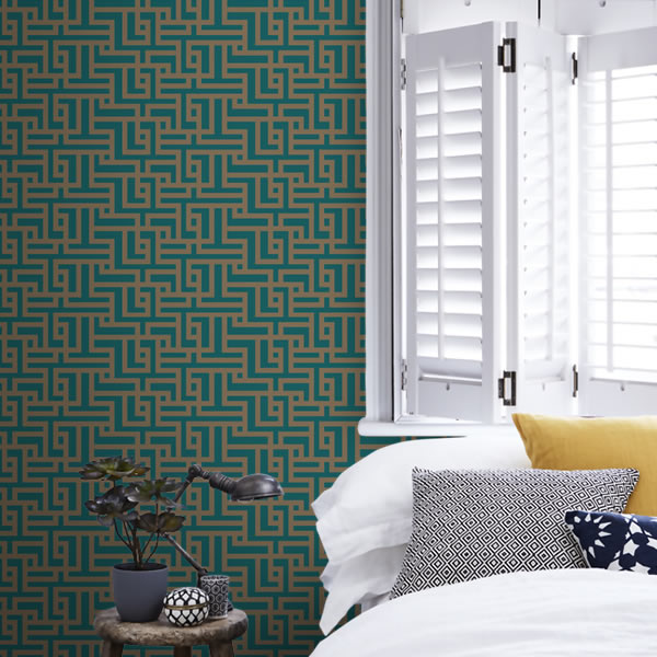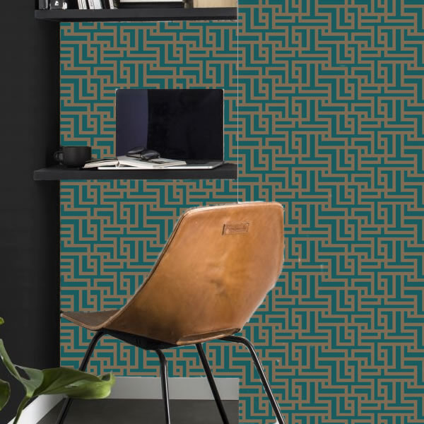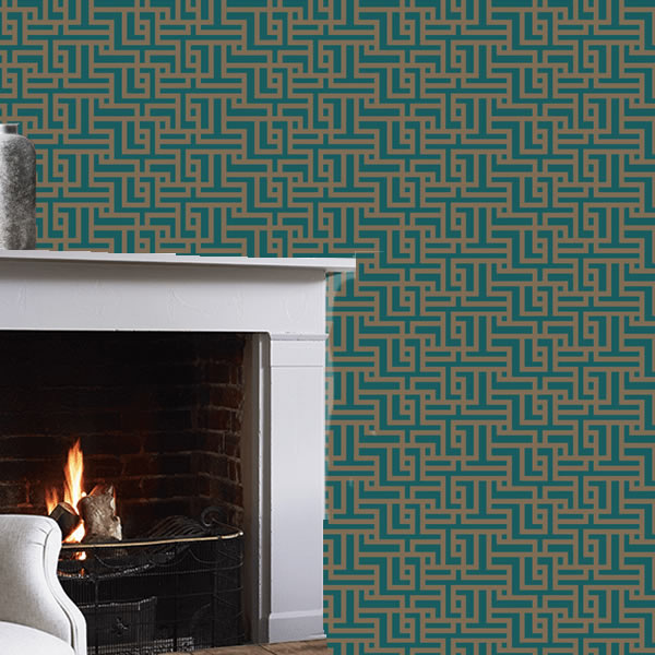 A maze-like geometric design in lustrous metallic copper printed on a lightly textured background. Shown here in the Teal colour.